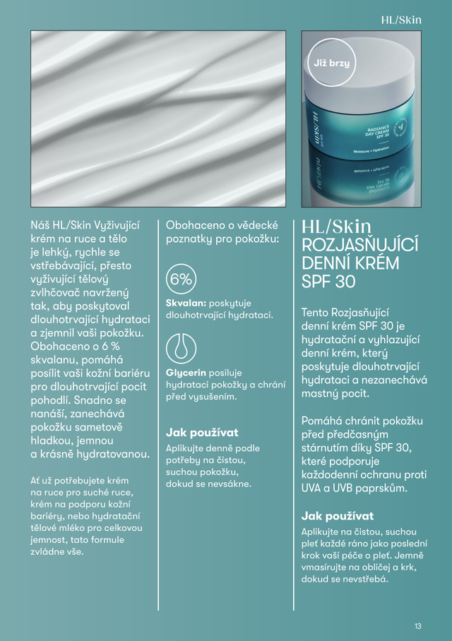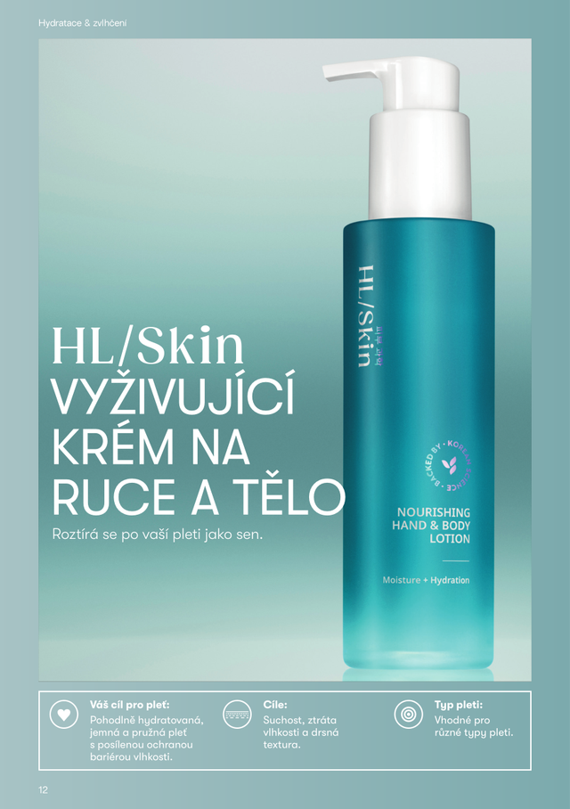 HL/Skin Vyživující krém na ruce a tělo je lehký, rychle se vstřebávající hydratační přípravek vyvinutý s pokročilou korejskou kosmetickou vědou. Obohaceno o 6 % skvalanu, vyživuje a zjemňuje pokožku a zároveň pomáhá zlepšit suchost. Toto složení také podporuje kožní bariéru, zanechává pokožku pružnou, hladkou a zdravě vypadající. Jeho nemastná textura se rychle vstřebává, což zajišťuje pohodlné každodenní použití. Jemné složení poskytuje bezpečnou a účinnou péči o vaši pleť.