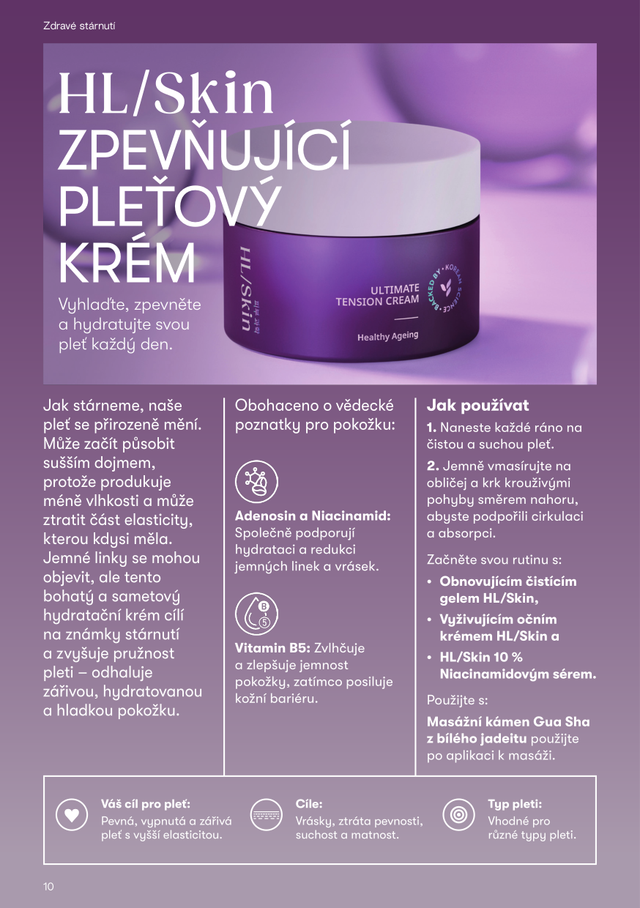 HL/Skin Zpevňující pleťový krém je bohatý, sametový hydratační krém vyvinutý s pomocí pokročilé korejské péče o pleť. Tato formule kombinuje adenosin, niacinamid a vitamín B5, aby zacílila na vrásky, zlepšila elasticitu pokožky a zajistila dlouhodobou hydrataci pro pevnější, hladší a zářivější pleť. Při pravidelném používání tento krém pomáhá obnovit zdravý a přirozený lesk pokožky. Je také vhodný pro použití pod make-up.